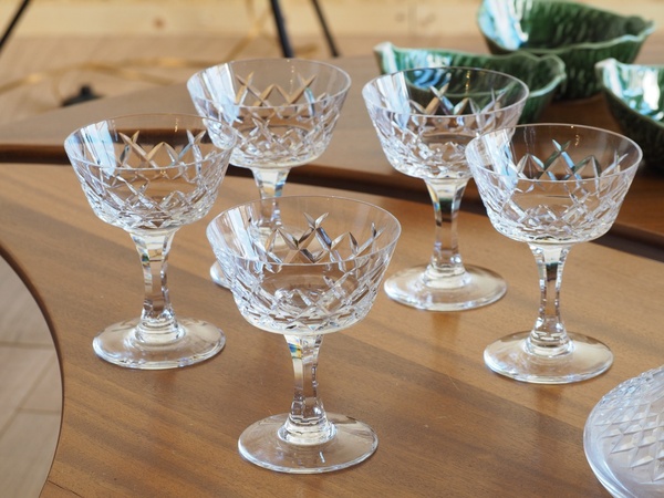 5 verres à pieds ciselés de style anglais. Leur contenance permet une large utilisation.