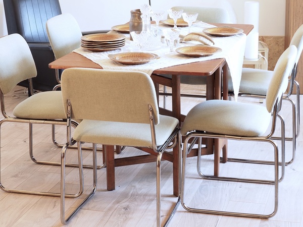 - État: Etat d'usage, chrome et tissu entièrement nettoyés. Légère trace au dos d'un dossier due au soleil, à peine visible. Petites rayures sur le chrome.